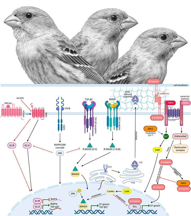 In one of the lab’s most comprehensive studies, we reveal previously unknown transient subcellular compartmentalization of key proteins that can explain how an ancient and unchanging regulatory network can nevertheless produce a diverse array of rapid and precise adjustments in avian beaks