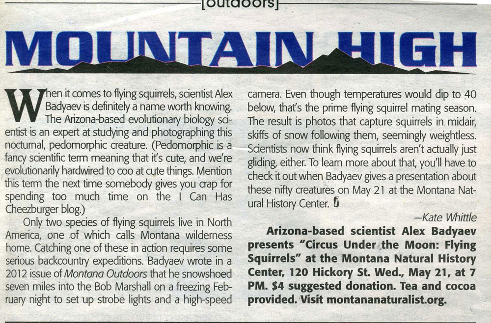 In the meantime, Montana Outdoors Magazine puts our flying squirrel (the winner of 2011 National Wildlife Award) on the cover of its November issue, highlighting our article on the evolution of gliding flight.